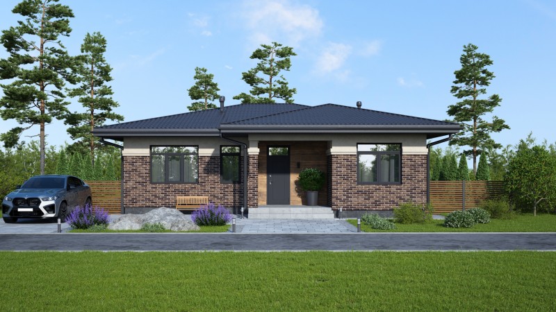 Красивый большой одноэтажный дом с оригинальными комбинированными фасадами, интересной кровлей. Имеет три спальни, одна из них мастер спальня с гардеробной и санузлом, просторную кухню гостиную с выходом на террасу, котельную-постирочную, второй санузел, закрытое от осадков крыльцо и просторную террасу.