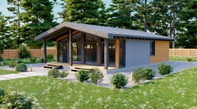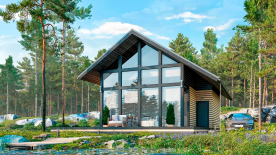 Дом для семьи из трех человек с просторной открытой террасой (22,7 м2). На входе в здание предусмотрен небольшой тамбур, где удобно хранить верхнюю одежду и уличную обувь.