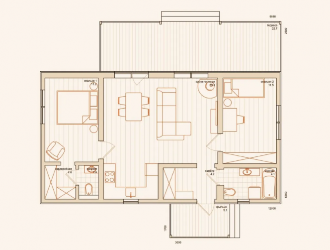 Одноэтажный дом для постоянного проживания 3-4 человек. Особенности проекта – наличие двух санузлов. Строительство дома на вашем участке займет не больше 4 дней.