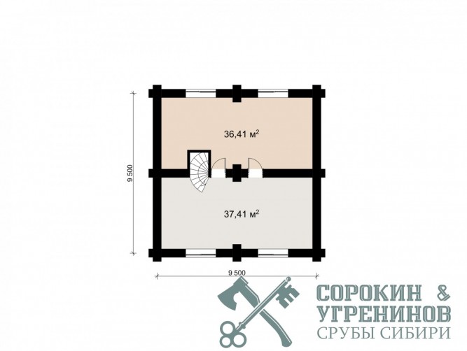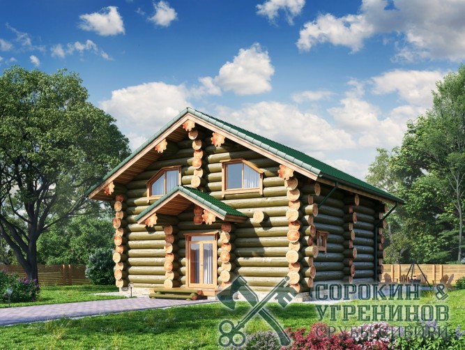 Проект дома из бревна диаметром 460мм, площадь дома 136м2. Размер сруба 9х9 метров. Первый этаж выполнен под свободную планировку, без перегородок и стен, только два несущих столба, вокруг одного из которых лестница на второй этаж. На втором этаже две большие комнаты, которые так же предполагают свободную планировку.